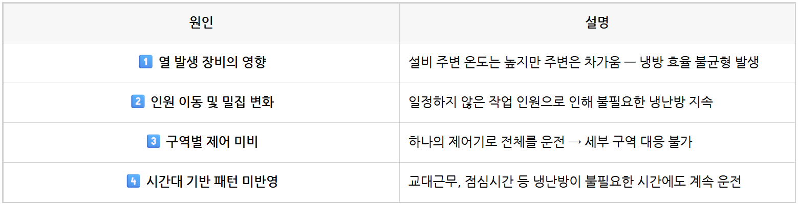 – 고열 장비 구역: 열 발생량 + 주변 온도 데이터 → 자동 냉방 보정