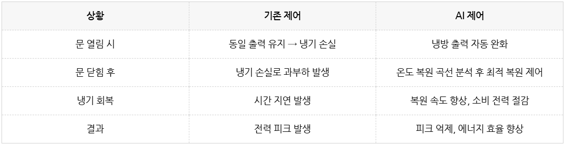 AI 제어 도입 시 최대 15~20%의 냉방 전력 절감 효과가 나타납니다.
