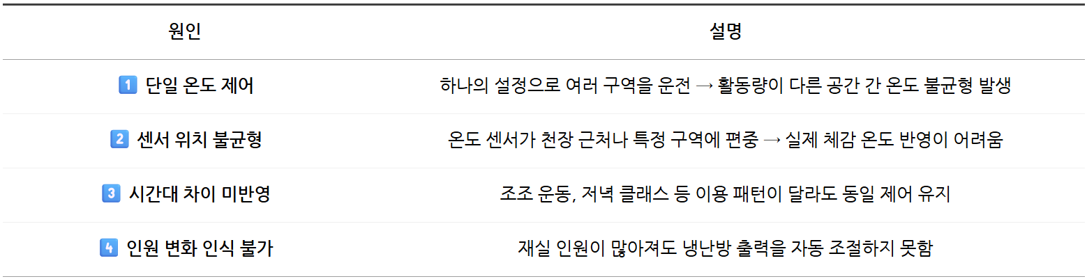 문제는 대부분의 시설이 하나의 냉난방기로 모든 구역을 제어한다는 점입니다.